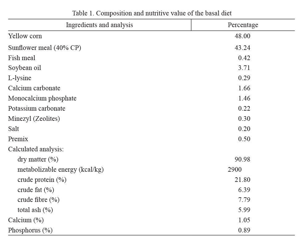 The experiment was performed in a commercial poultry farm. The animals were accommodated in cages during the period of rearing (7 chickens per cage) up to 20 weeks of age and after that 5 per cage until the end of the 37th week of age. Fifty roosters, 20 weeks old, were divided into 5 groups (ten in each group, two cages per group) and fed different amounts of additional isoflavones. Group 0 was blank with no additional isoflavones in the feed and in the other 4 groups soy isoflavones were added in amounts of 0, 300, 600, 1200 and 1800 mg/kg of feed. The composition and nutritive value of the basal diet is presented in Table 1.