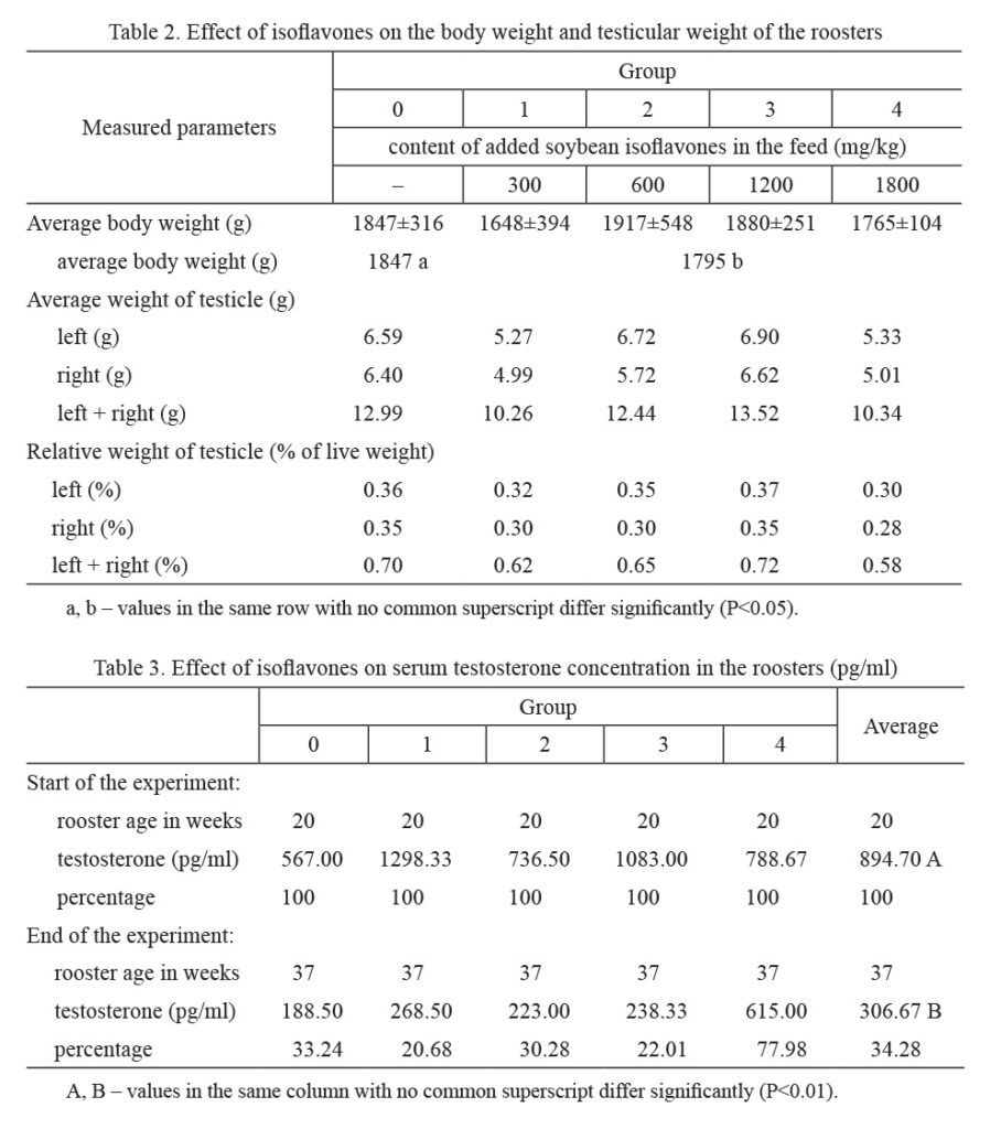 The roosters received additional isoflavones from 20 to 37 weeks of age. The body weight of the roosters was measured with a special digital balance at the beginning and at the end of the experiment. Blood samples at the 20th week were taken from 5 marked roosters, after the accommodation of 5 days, directly from the heart (cardiac puncture), and at the end of the 37th week from the same animals.